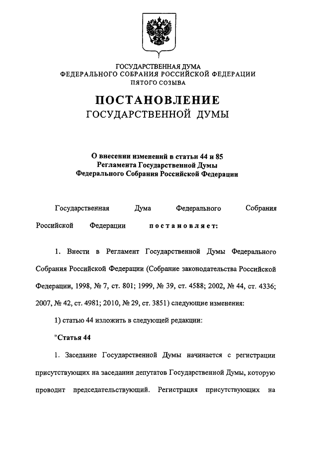 "О ВНЕСЕНИИ ИЗМЕНЕНИЙ В СТАТЬИ 44 И 85 РЕГЛАМЕНТА ГОСУДАРСТВЕННОЙ ДУМЫ ФЕДЕРАЛЬНОГО СОБРАНИЯ РОССИЙСКОЙ ФЕДЕРАЦИИ"
