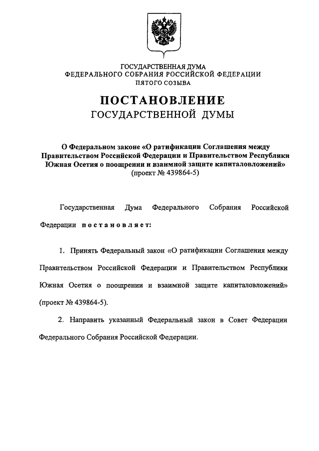 "О ФЕДЕРАЛЬНОМ ЗАКОНЕ "О РАТИФИКАЦИИ СОГЛАШЕНИЯ МЕЖДУ ПРАВИТЕЛЬСТВОМ РОССИЙСКОЙ ФЕДЕРАЦИИ И ПРАВИТЕЛЬСТВОМ РЕСПУБЛИКИ ЮЖНАЯ ОСЕТИЯ О ПООЩРЕНИИ И ВЗАИМНОЙ ЗАЩИТЕ КАПИТАЛОВЛОЖЕНИЙ" (ПРОЕКТ N 439864-5)"