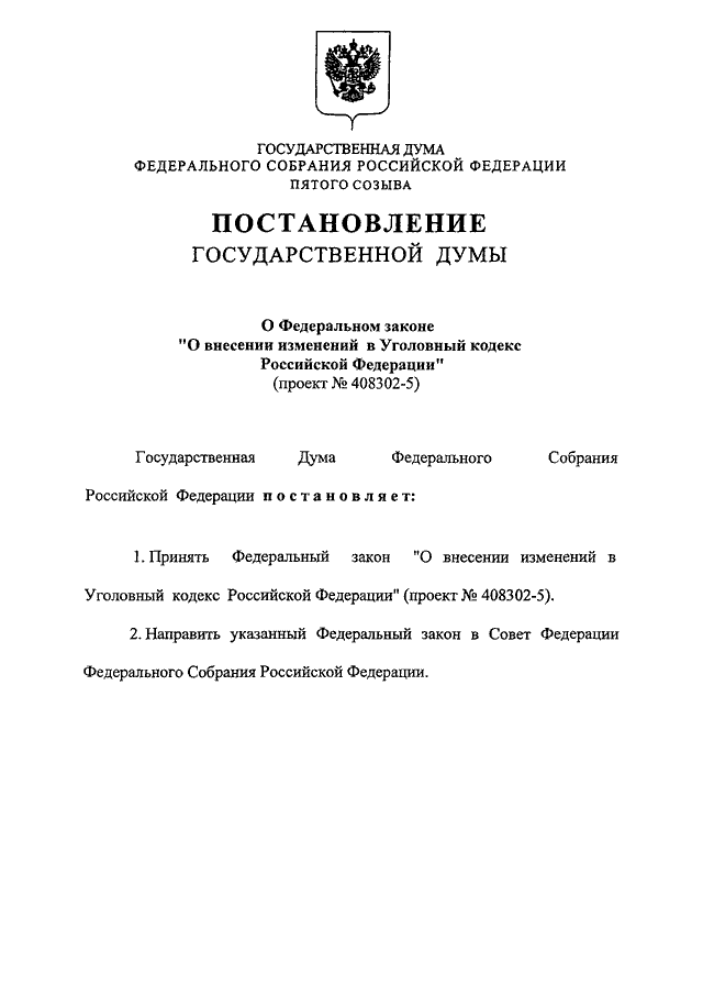 "О ФЕДЕРАЛЬНОМ ЗАКОНЕ "О ВНЕСЕНИИ ИЗМЕНЕНИЙ В УГОЛОВНЫЙ КОДЕКС РОССИЙСКОЙ ФЕДЕРАЦИИ" (ПРОЕКТ N 408302-5)"