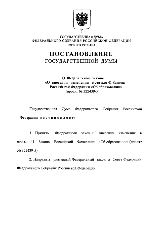 "О ФЕДЕРАЛЬНОМ ЗАКОНЕ "О ВНЕСЕНИИ ИЗМЕНЕНИЯ В СТАТЬЮ 41 ЗАКОНА РОССИЙСКОЙ ФЕДЕРАЦИИ "ОБ ОБРАЗОВАНИИ" (ПРОЕКТ N 322439-5)"