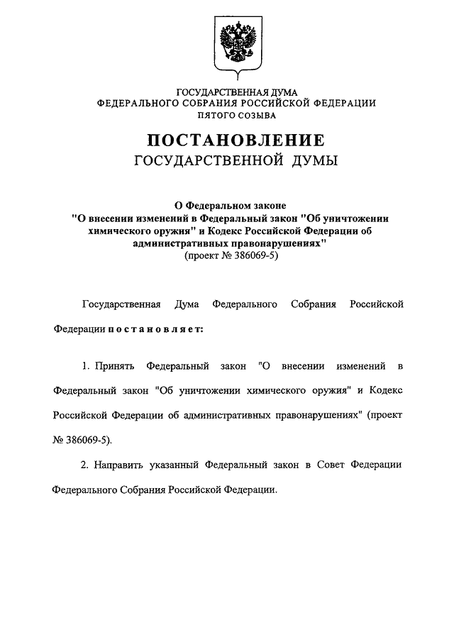 "О ФЕДЕРАЛЬНОМ ЗАКОНЕ "О ВНЕСЕНИИ ИЗМЕНЕНИЙ В ФЕДЕРАЛЬНЫЙ ЗАКОН "ОБ УНИЧТОЖЕНИИ ХИМИЧЕСКОГО ОРУЖИЯ" И КОДЕКС РОССИЙСКОЙ ФЕДЕРАЦИИ ОБ АДМИНИСТРАТИВНЫХ ПРАВОНАРУШЕНИЯХ" (ПРОЕКТ N 386069-5)"