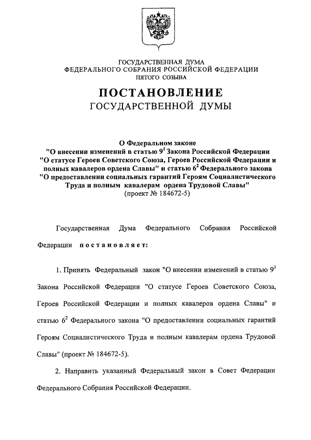 "О ФЕДЕРАЛЬНОМ ЗАКОНЕ "О ВНЕСЕНИИ ИЗМЕНЕНИЙ В СТАТЬЮ 9.1 ЗАКОНА РОССИЙСКОЙ ФЕДЕРАЦИИ "О СТАТУСЕ ГЕРОЕВ СОВЕТСКОГО СОЮЗА, ГЕРОЕВ РОССИЙСКОЙ ФЕДЕРАЦИИ И ПОЛНЫХ КАВАЛЕРОВ ОРДЕНА СЛАВЫ" И СТАТЬЮ 6.2 ФЕДЕРАЛЬНОГО ЗАКОНА "О ПРЕДОСТАВЛЕНИИ СОЦИАЛЬНЫХ ГАРАНТИЙ ГЕРОЯМ СОЦИАЛИСТИЧЕСКОГО ТРУДА И ПОЛНЫМ КАВАЛЕРАМ ОРДЕНА ТРУДОВОЙ СЛАВЫ" (ПРОЕКТ N 184672-5)"