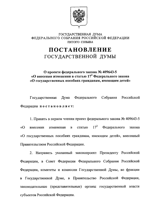 "О ПРОЕКТЕ ФЕДЕРАЛЬНОГО ЗАКОНА N 409643-5 "О ВНЕСЕНИИ ИЗМЕНЕНИЯ В СТАТЬЮ 17.2 ФЕДЕРАЛЬНОГО ЗАКОНА "О ГОСУДАРСТВЕННЫХ ПОСОБИЯХ ГРАЖДАНАМ, ИМЕЮЩИМ ДЕТЕЙ"