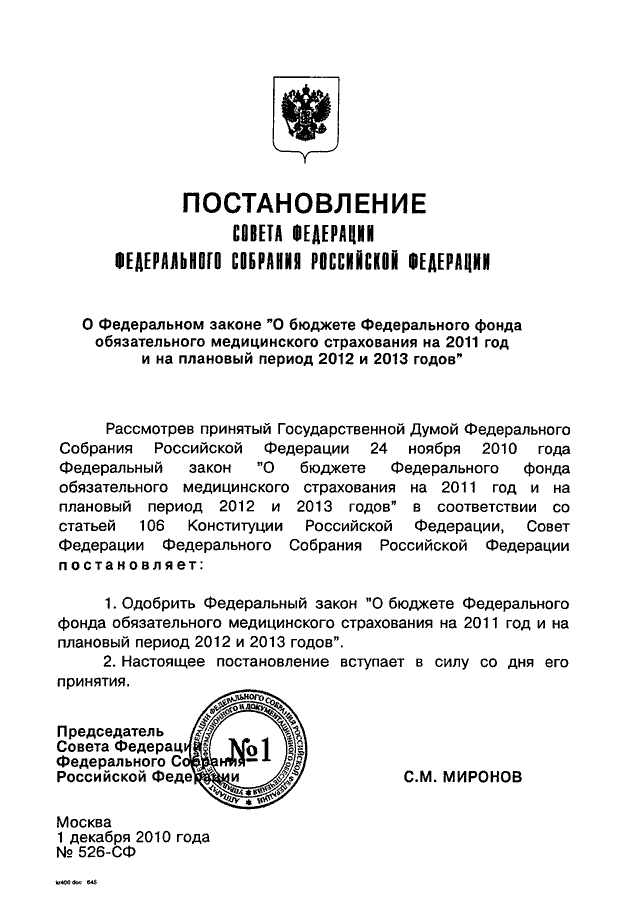 ПОСТАНОВЛЕНИЕ СФ ФС РФ от 01.12.2010 N 526-СФ
