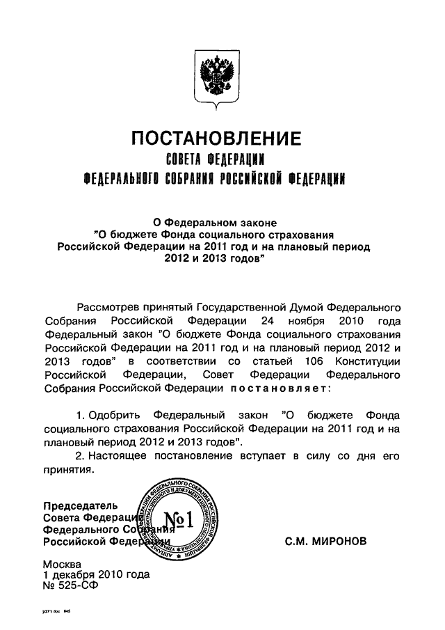 ПОСТАНОВЛЕНИЕ СФ ФС РФ от 01.12.2010 N 525-СФ