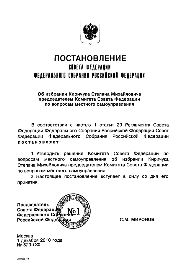 "ОБ ИЗБРАНИИ КИРИЧУКА СТЕПАНА МИХАЙЛОВИЧА ПРЕДСЕДАТЕЛЕМ КОМИТЕТА СОВЕТА ФЕДЕРАЦИИ ПО ВОПРОСАМ МЕСТНОГО САМОУПРАВЛЕНИЯ"
