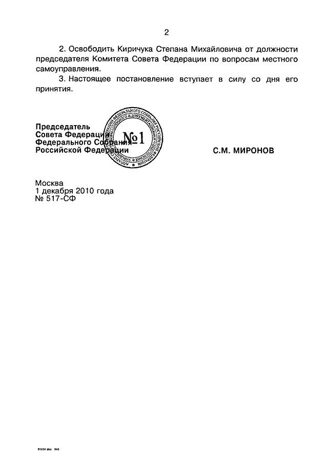 ПОСТАНОВЛЕНИЕ СФ ФС РФ от 01.12.2010 N 517-СФ