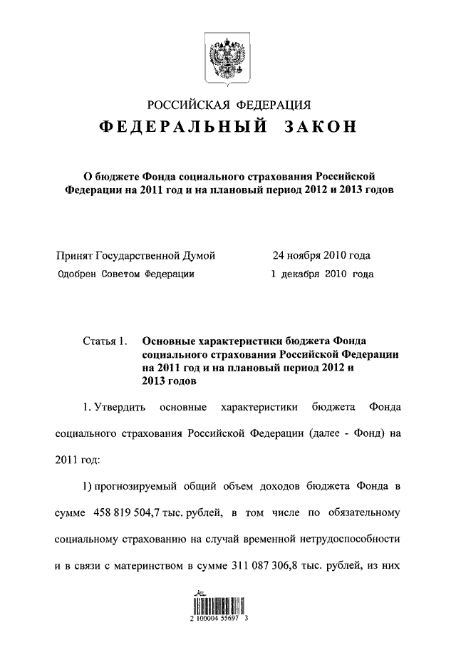"О БЮДЖЕТЕ ФОНДА СОЦИАЛЬНОГО СТРАХОВАНИЯ РОССИЙСКОЙ ФЕДЕРАЦИИ НА 2011 ГОД И НА ПЛАНОВЫЙ ПЕРИОД 2012 И 2013 ГОДОВ"
