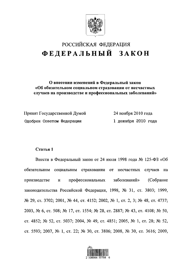 "О ВНЕСЕНИИ ИЗМЕНЕНИЙ В ФЕДЕРАЛЬНЫЙ ЗАКОН "ОБ ОБЯЗАТЕЛЬНОМ СОЦИАЛЬНОМ СТРАХОВАНИИ ОТ НЕСЧАСТНЫХ СЛУЧАЕВ НА ПРОИЗВОДСТВЕ И ПРОФЕССИОНАЛЬНЫХ ЗАБОЛЕВАНИЙ"
