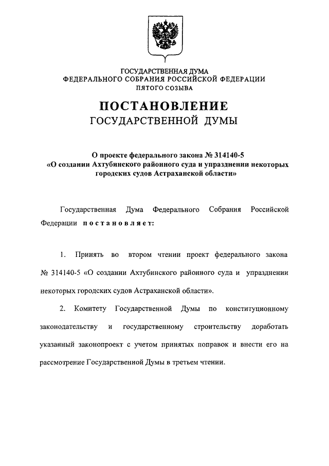 "О ПРОЕКТЕ ФЕДЕРАЛЬНОГО ЗАКОНА N 314140-5 "О СОЗДАНИИ АХТУБИНСКОГО РАЙОННОГО СУДА И УПРАЗДНЕНИИ НЕКОТОРЫХ ГОРОДСКИХ СУДОВ АСТРАХАНСКОЙ ОБЛАСТИ"