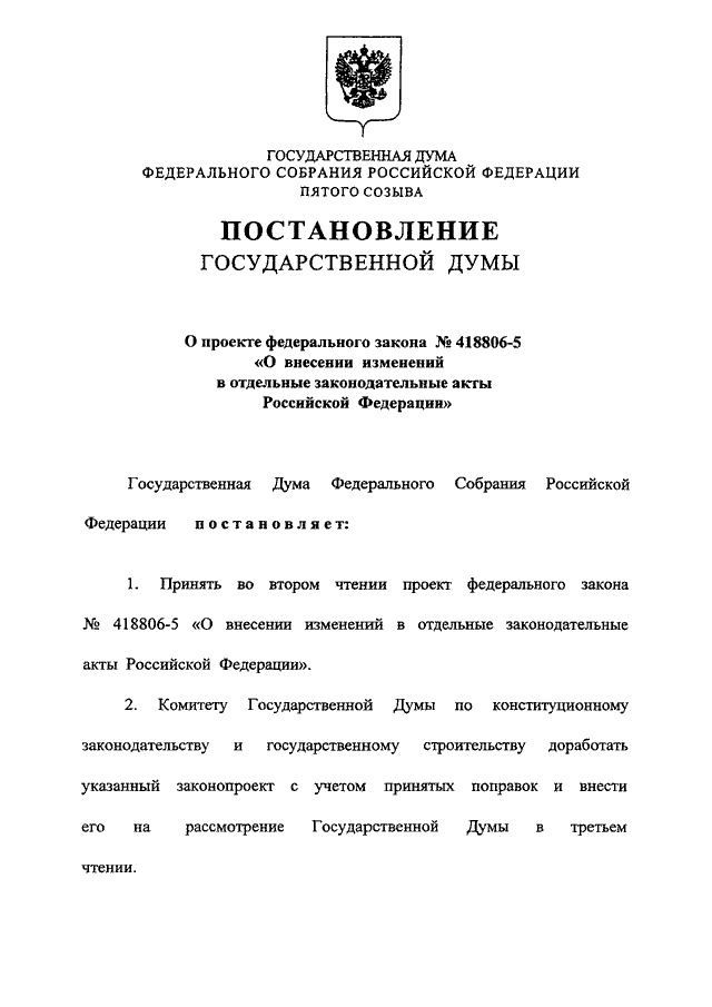 "О ПРОЕКТЕ ФЕДЕРАЛЬНОГО ЗАКОНА N 418806-5 "О ВНЕСЕНИИ ИЗМЕНЕНИЙ В ОТДЕЛЬНЫЕ ЗАКОНОДАТЕЛЬНЫЕ АКТЫ РОССИЙСКОЙ ФЕДЕРАЦИИ"