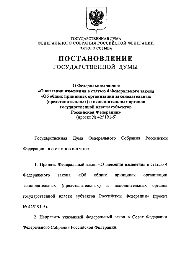 "О ФЕДЕРАЛЬНОМ ЗАКОНЕ "О ВНЕСЕНИИ ИЗМЕНЕНИЯ В СТАТЬЮ 4 ФЕДЕРАЛЬНОГО ЗАКОНА "ОБ ОБЩИХ ПРИНЦИПАХ ОРГАНИЗАЦИИ ЗАКОНОДАТЕЛЬНЫХ (ПРЕДСТАВИТЕЛЬНЫХ) И ИСПОЛНИТЕЛЬНЫХ ОРГАНОВ ГОСУДАРСТВЕННОЙ ВЛАСТИ СУБЪЕКТОВ РОССИЙСКОЙ ФЕДЕРАЦИИ" (ПРОЕКТ N 425191-5)"