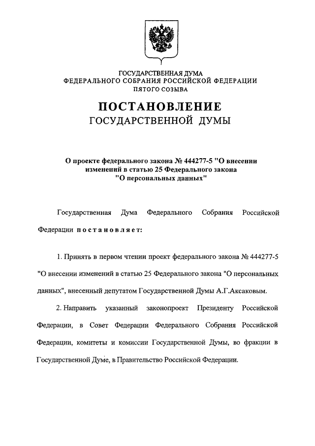 "О ПРОЕКТЕ ФЕДЕРАЛЬНОГО ЗАКОНА N 444277-5 "О ВНЕСЕНИИ ИЗМЕНЕНИЙ В СТАТЬЮ 25 ФЕДЕРАЛЬНОГО ЗАКОНА "О ПЕРСОНАЛЬНЫХ ДАННЫХ"