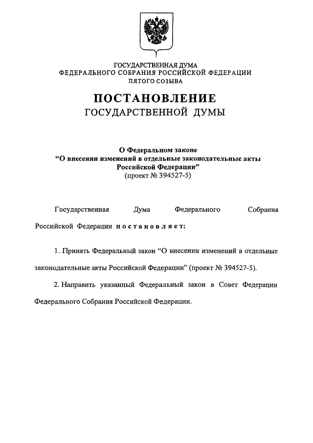 "О ФЕДЕРАЛЬНОМ ЗАКОНЕ "О ВНЕСЕНИИ ИЗМЕНЕНИЙ В ОТДЕЛЬНЫЕ ЗАКОНОДАТЕЛЬНЫЕ АКТЫ РОССИЙСКОЙ ФЕДЕРАЦИИ" (ПРОЕКТ N 394527-5)"