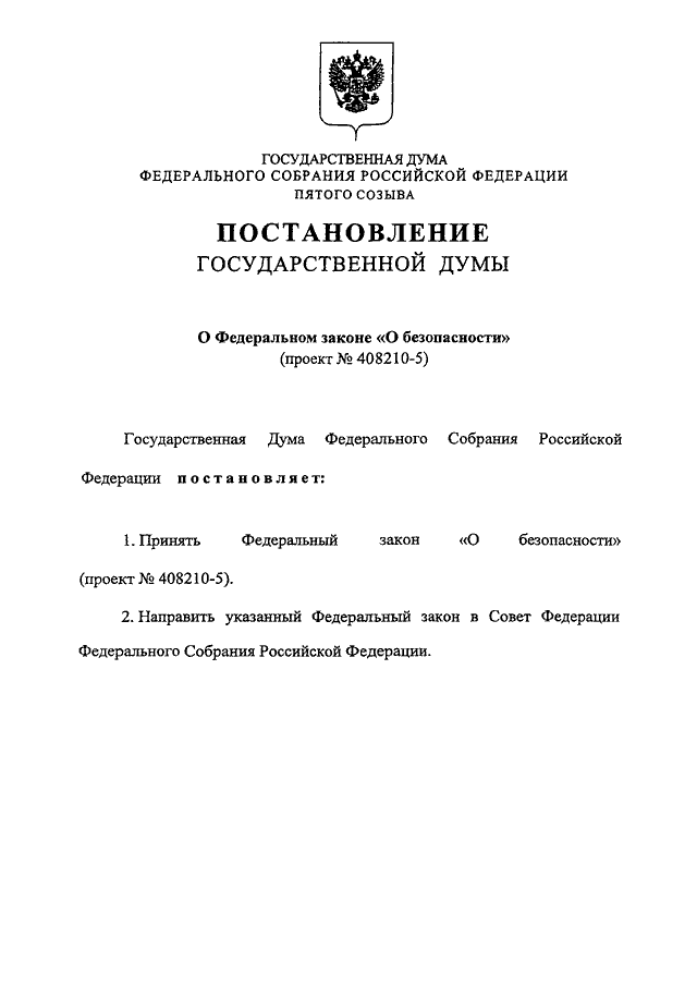 "О ФЕДЕРАЛЬНОМ ЗАКОНЕ "О БЕЗОПАСНОСТИ" (ПРОЕКТ N 408210-5)"