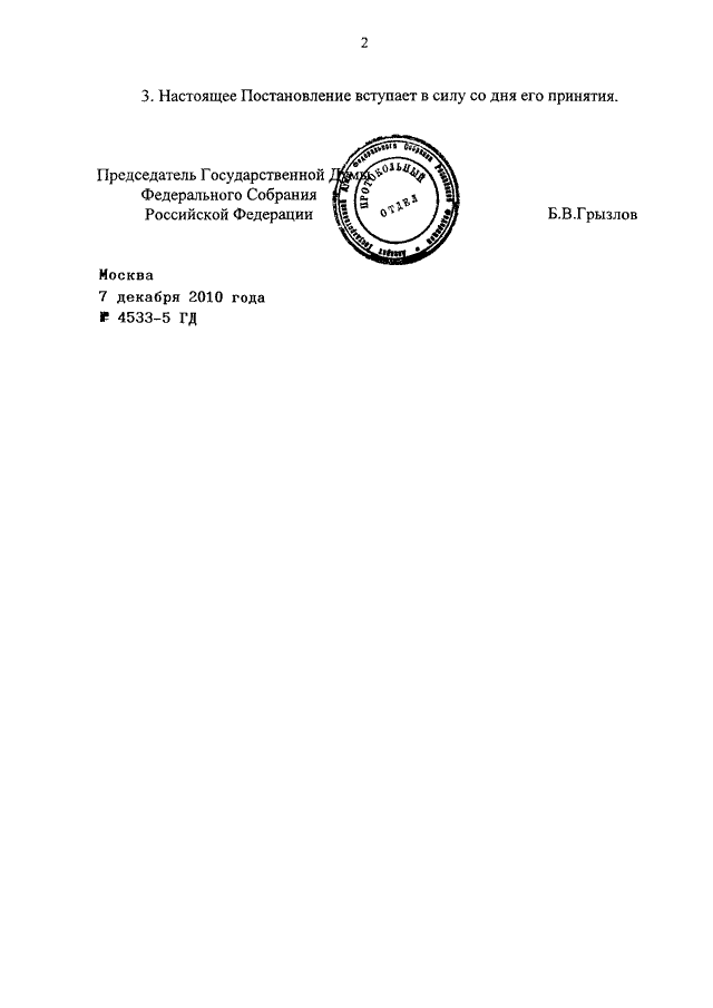 ПОСТАНОВЛЕНИЕ ГД ФС РФ от 07.12.2010 N 4533-5 ГД