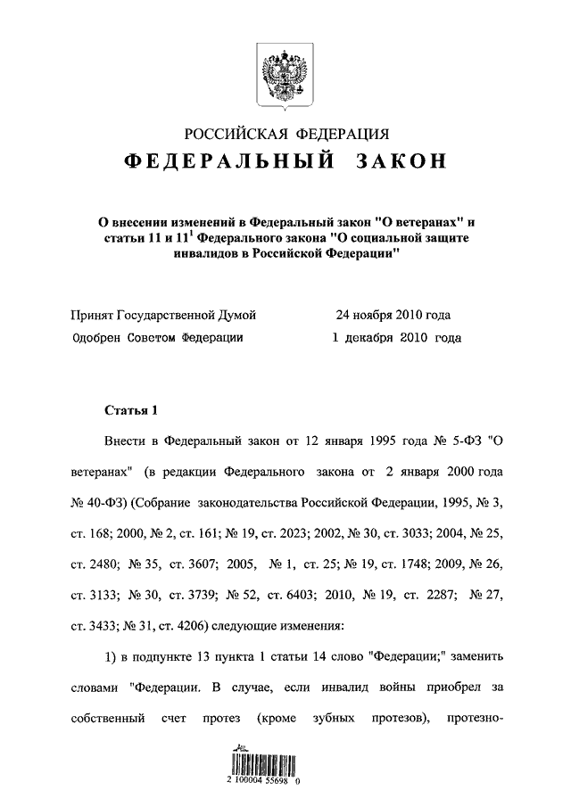 "О ВНЕСЕНИИ ИЗМЕНЕНИЙ В ФЕДЕРАЛЬНЫЙ ЗАКОН "О ВЕТЕРАНАХ" И СТАТЬИ 11 И 11.1 ФЕДЕРАЛЬНОГО ЗАКОНА "О СОЦИАЛЬНОЙ ЗАЩИТЕ ИНВАЛИДОВ В РОССИЙСКОЙ ФЕДЕРАЦИИ"