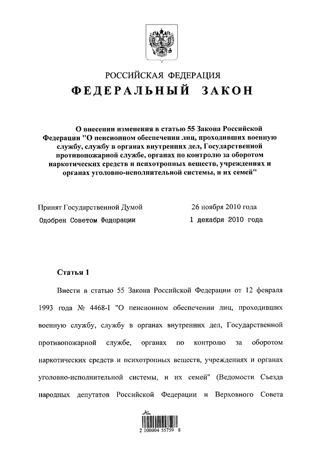 "О ВНЕСЕНИИ ИЗМЕНЕНИЯ В СТАТЬЮ 55 ЗАКОНА РОССИЙСКОЙ ФЕДЕРАЦИИ "О ПЕНСИОННОМ ОБЕСПЕЧЕНИИ ЛИЦ, ПРОХОДИВШИХ ВОЕННУЮ СЛУЖБУ, СЛУЖБУ В ОРГАНАХ ВНУТРЕННИХ ДЕЛ, ГОСУДАРСТВЕННОЙ ПРОТИВОПОЖАРНОЙ СЛУЖБЕ, ОРГАНАХ ПО КОНТРОЛЮ ЗА ОБОРОТОМ НАРКОТИЧЕСКИХ СРЕДСТВ И ПСИХОТРОПНЫХ ВЕЩЕСТВ, УЧРЕЖДЕНИЯХ И ОРГАНАХ УГОЛОВНО - ИСПОЛНИТЕЛЬНОЙ СИСТЕМЫ, И ИХ СЕМЕЙ"