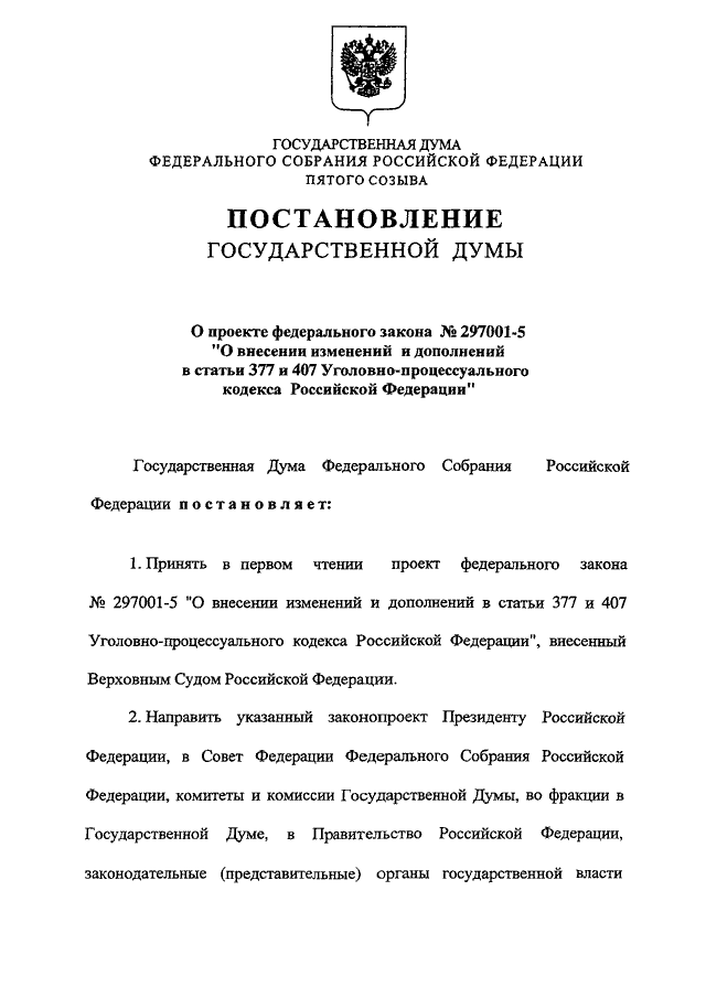 "О ПРОЕКТЕ ФЕДЕРАЛЬНОГО ЗАКОНА N 297001-5 "О ВНЕСЕНИИ ИЗМЕНЕНИЙ И ДОПОЛНЕНИЙ В СТАТЬИ 377 И 407 УГОЛОВНО - ПРОЦЕССУАЛЬНОГО КОДЕКСА РОССИЙСКОЙ ФЕДЕРАЦИИ"