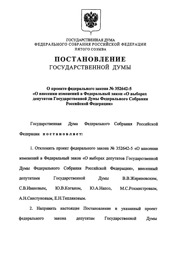 "О ПРОЕКТЕ ФЕДЕРАЛЬНОГО ЗАКОНА N 352642-5 "О ВНЕСЕНИИ ИЗМЕНЕНИЙ В ФЕДЕРАЛЬНЫЙ ЗАКОН "О ВЫБОРАХ ДЕПУТАТОВ ГОСУДАРСТВЕННОЙ ДУМЫ ФЕДЕРАЛЬНОГО СОБРАНИЯ РОССИЙСКОЙ ФЕДЕРАЦИИ"