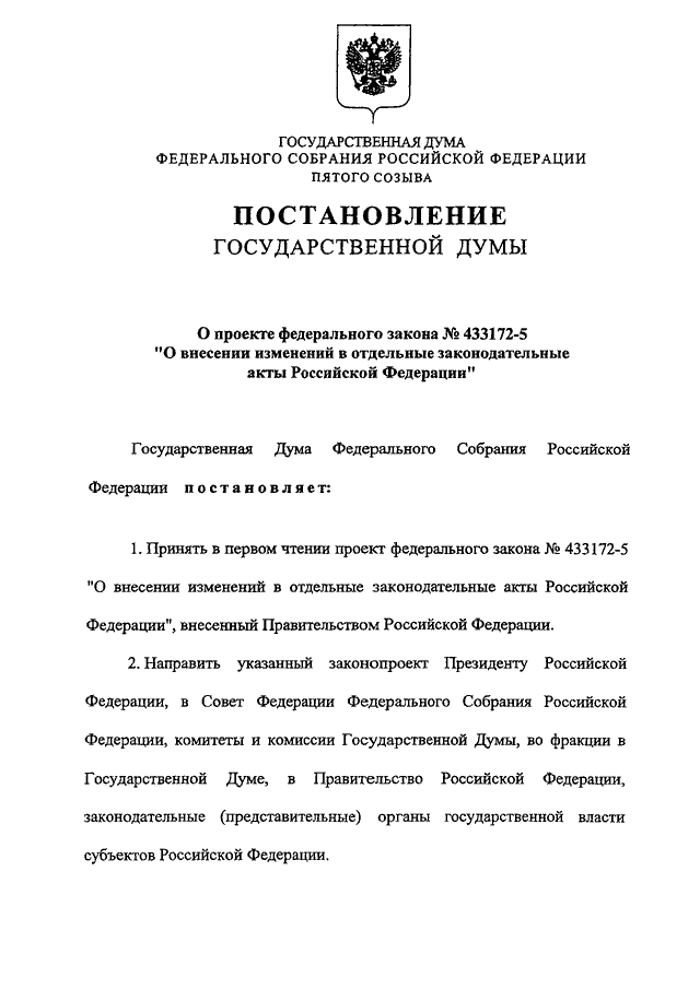 "О ПРОЕКТЕ ФЕДЕРАЛЬНОГО ЗАКОНА N 433172-5 "О ВНЕСЕНИИ ИЗМЕНЕНИЙ В ОТДЕЛЬНЫЕ ЗАКОНОДАТЕЛЬНЫЕ АКТЫ РОССИЙСКОЙ ФЕДЕРАЦИИ"