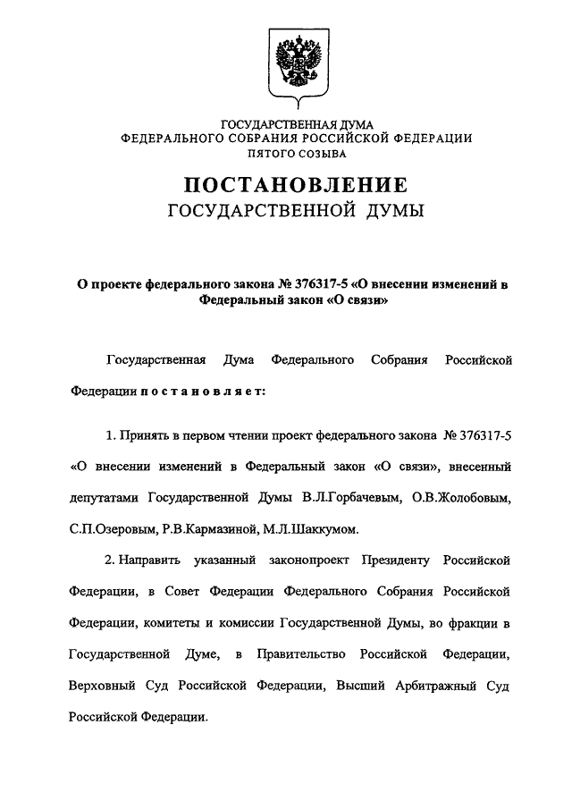 "О ПРОЕКТЕ ФЕДЕРАЛЬНОГО ЗАКОНА N 376317-5 "О ВНЕСЕНИИ ИЗМЕНЕНИЙ В ФЕДЕРАЛЬНЫЙ ЗАКОН "О СВЯЗИ"
