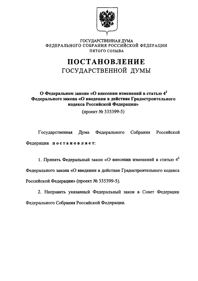"О ФЕДЕРАЛЬНОМ ЗАКОНЕ "О ВНЕСЕНИИ ИЗМЕНЕНИЙ В СТАТЬЮ 4.2 ФЕДЕРАЛЬНОГО ЗАКОНА "О ВВЕДЕНИИ В ДЕЙСТВИЕ ГРАДОСТРОИТЕЛЬНОГО КОДЕКСА РОССИЙСКОЙ ФЕДЕРАЦИИ" (ПРОЕКТ N 335399-5)"