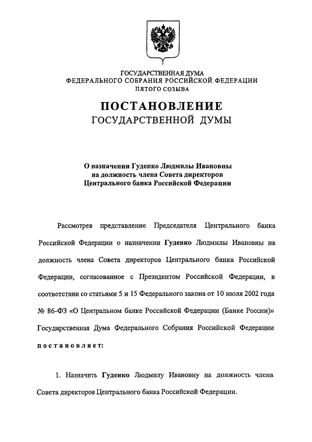 "О НАЗНАЧЕНИИ ГУДЕНКО ЛЮДМИЛЫ ИВАНОВНЫ НА ДОЛЖНОСТЬ ЧЛЕНА СОВЕТА ДИРЕКТОРОВ ЦЕНТРАЛЬНОГО БАНКА РОССИЙСКОЙ ФЕДЕРАЦИИ"