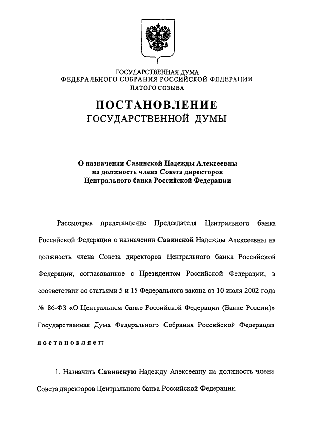 "О НАЗНАЧЕНИИ САВИНСКОЙ НАДЕЖДЫ АЛЕКСЕЕВНЫ НА ДОЛЖНОСТЬ ЧЛЕНА СОВЕТА ДИРЕКТОРОВ ЦЕНТРАЛЬНОГО БАНКА РОССИЙСКОЙ ФЕДЕРАЦИИ"