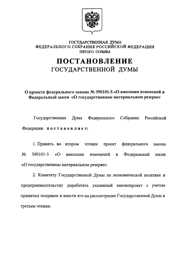 "О ПРОЕКТЕ ФЕДЕРАЛЬНОГО ЗАКОНА N 390101-5 "О ВНЕСЕНИИ ИЗМЕНЕНИЙ В ФЕДЕРАЛЬНЫЙ ЗАКОН "О ГОСУДАРСТВЕННОМ МАТЕРИАЛЬНОМ РЕЗЕРВЕ"