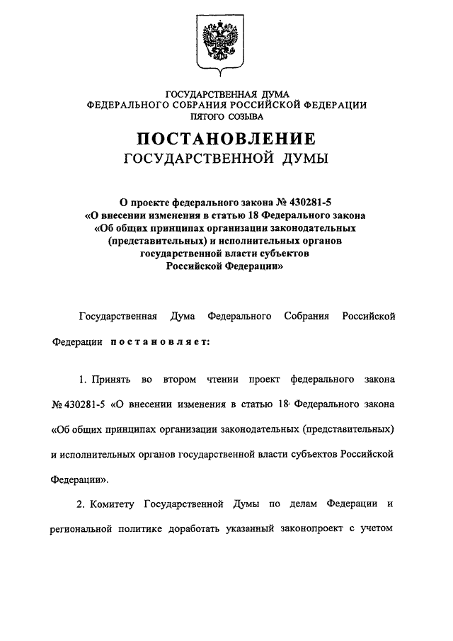 "О ПРОЕКТЕ ФЕДЕРАЛЬНОГО ЗАКОНА N 430281-5 "О ВНЕСЕНИИ ИЗМЕНЕНИЯ В
