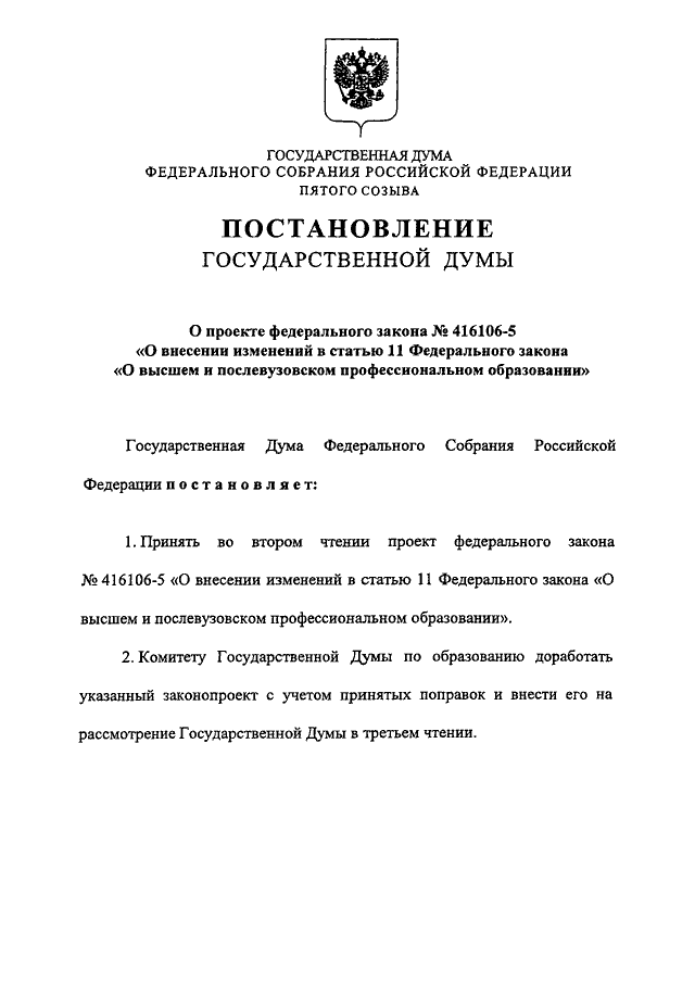"О ПРОЕКТЕ ФЕДЕРАЛЬНОГО ЗАКОНА N 416106-5 "О ВНЕСЕНИИ ИЗМЕНЕНИЙ В СТАТЬЮ 11 ФЕДЕРАЛЬНОГО ЗАКОНА "О ВЫСШЕМ И ПОСЛЕВУЗОВСКОМ ПРОФЕССИОНАЛЬНОМ ОБРАЗОВАНИИ"