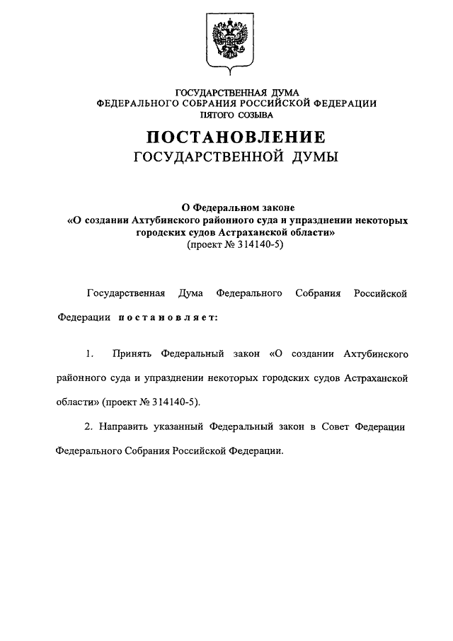 "О ФЕДЕРАЛЬНОМ ЗАКОНЕ "О СОЗДАНИИ АХТУБИНСКОГО РАЙОННОГО СУДА И УПРАЗДНЕНИИ НЕКОТОРЫХ ГОРОДСКИХ СУДОВ АСТРАХАНСКОЙ ОБЛАСТИ" (ПРОЕКТ N 314140-5)"