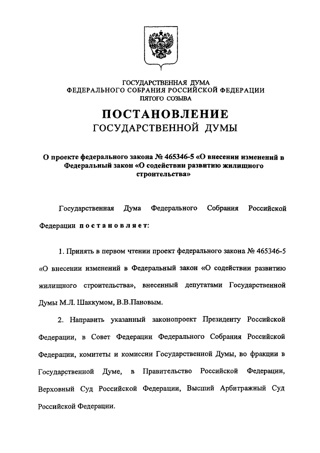 "О ПРОЕКТЕ ФЕДЕРАЛЬНОГО ЗАКОНА N 465346-5 "О ВНЕСЕНИИ ИЗМЕНЕНИЙ В ФЕДЕРАЛЬНЫЙ ЗАКОН "О СОДЕЙСТВИИ РАЗВИТИЮ ЖИЛИЩНОГО СТРОИТЕЛЬСТВА"