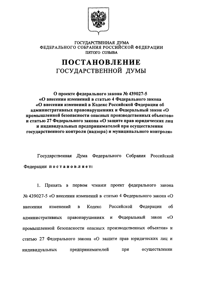 "О ПРОЕКТЕ ФЕДЕРАЛЬНОГО ЗАКОНА N 439027-5 "О ВНЕСЕНИИ ИЗМЕНЕНИЙ В