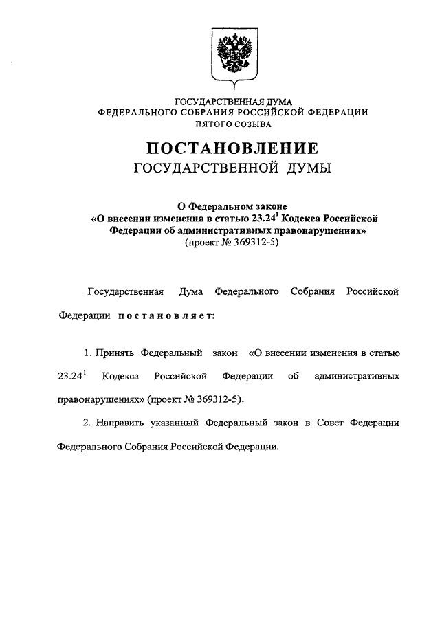 "О ФЕДЕРАЛЬНОМ ЗАКОНЕ "О ВНЕСЕНИИ ИЗМЕНЕНИЯ В СТАТЬЮ 23.24.1 КОДЕКСА РОССИЙСКОЙ ФЕДЕРАЦИИ ОБ АДМИНИСТРАТИВНЫХ ПРАВОНАРУШЕНИЯХ" (ПРОЕКТ N 369312-5)"