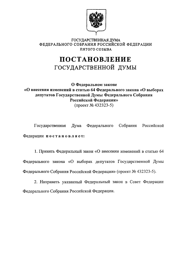 "О ФЕДЕРАЛЬНОМ ЗАКОНЕ "О ВНЕСЕНИИ ИЗМЕНЕНИЙ В СТАТЬЮ 64 ФЕДЕРАЛЬНОГО ЗАКОНА "О ВЫБОРАХ ДЕПУТАТОВ ГОСУДАРСТВЕННОЙ ДУМЫ ФЕДЕРАЛЬНОГО СОБРАНИЯ РОССИЙСКОЙ ФЕДЕРАЦИИ" (ПРОЕКТ N 432323-5)"