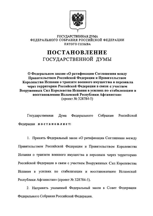 ИСПАНИЯ О ТРАНЗИТЕ ВОЕННОГО ИМУЩЕСТВА И ПЕРСОНАЛА ЧЕРЕЗ ТЕРРИТОРИЮ
