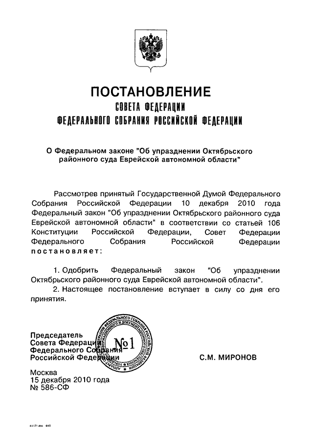 ПОСТАНОВЛЕНИЕ СФ ФС РФ от 15.12.2010 N 586-СФ