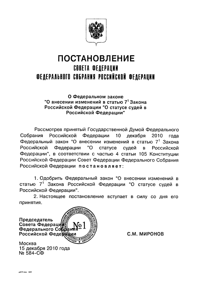 ПОСТАНОВЛЕНИЕ СФ ФС РФ от 15.12.2010 N 584-СФ