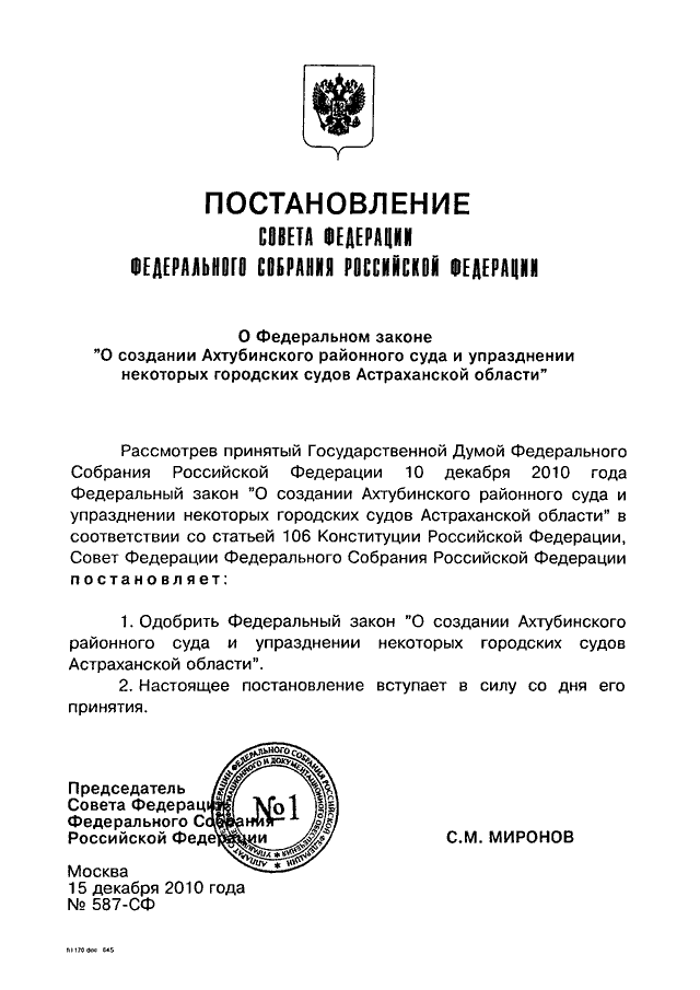 ПОСТАНОВЛЕНИЕ СФ ФС РФ от 15.12.2010 N 587-СФ