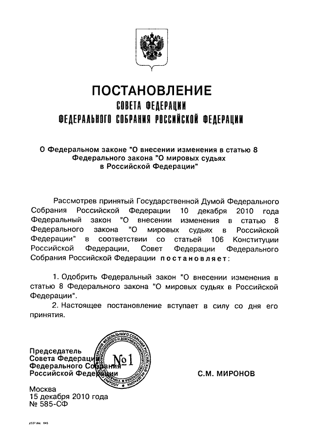ПОСТАНОВЛЕНИЕ СФ ФС РФ от 15.12.2010 N 585-СФ