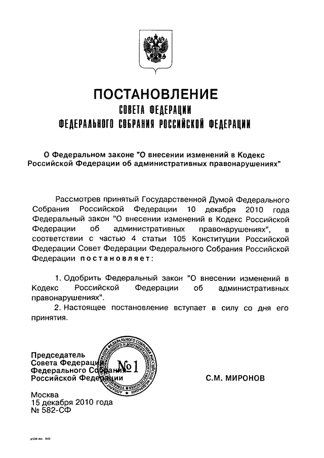 ПОСТАНОВЛЕНИЕ СФ ФС РФ от 15.12.2010 N 582-СФ