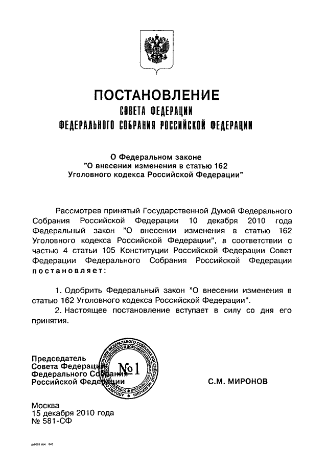 ПОСТАНОВЛЕНИЕ СФ ФС РФ от 15.12.2010 N 581-СФ