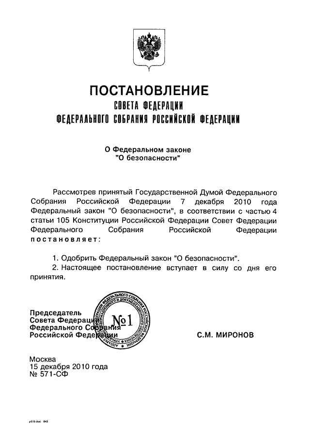 ПОСТАНОВЛЕНИЕ СФ ФС РФ от 15.12.2010 N 571-СФ