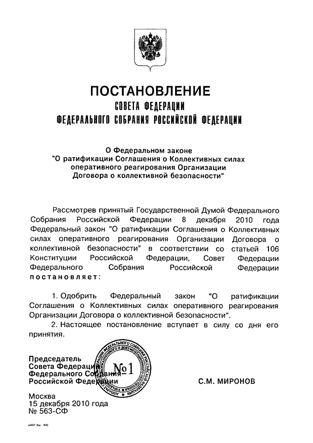 ПОСТАНОВЛЕНИЕ СФ ФС РФ от 15.12.2010 N 563-СФ