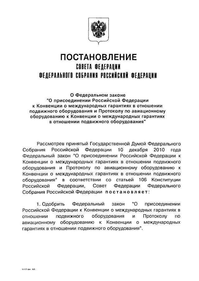 "О ФЕДЕРАЛЬНОМ ЗАКОНЕ "О ПРИСОЕДИНЕНИИ РОССИЙСКОЙ ФЕДЕРАЦИИ К КОНВЕНЦИИ О МЕЖДУНАРОДНЫХ ГАРАНТИЯХ В ОТНОШЕНИИ ПОДВИЖНОГО ОБОРУДОВАНИЯ И ПРОТОКОЛУ ПО АВИАЦИОННОМУ ОБОРУДОВАНИЮ К КОНВЕНЦИИ О МЕЖДУНАРОДНЫХ ГАРАНТИЯХ В ОТНОШЕНИИ ПОДВИЖНОГО ОБОРУДОВАНИЯ"