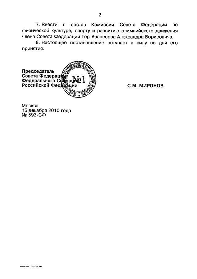 ПОСТАНОВЛЕНИЕ СФ ФС РФ от 15.12.2010 N 593-СФ