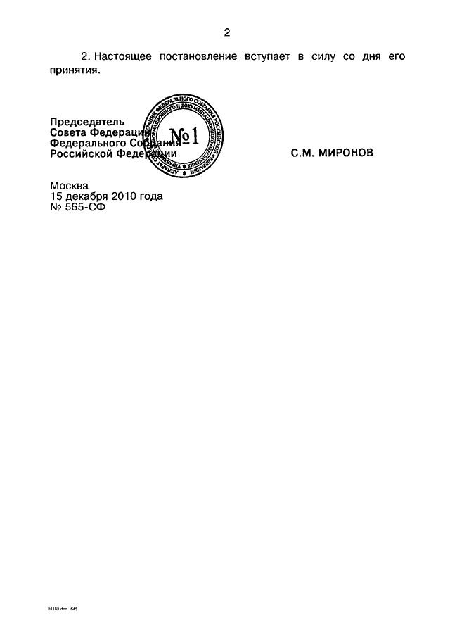 ПОСТАНОВЛЕНИЕ СФ ФС РФ от 15.12.2010 N 565-СФ