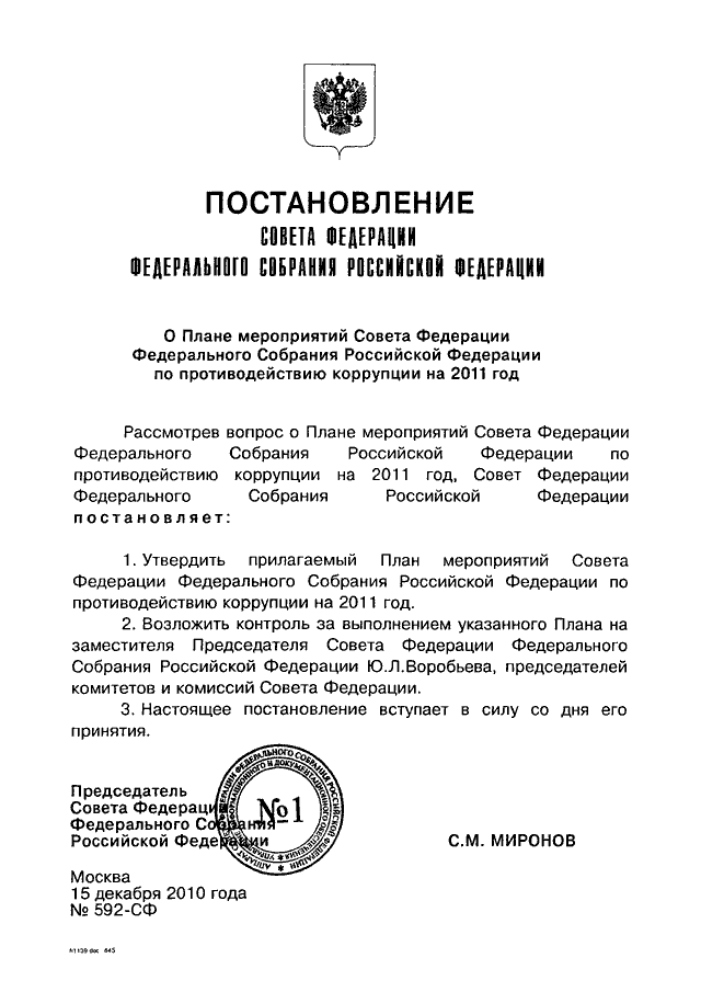 "О ПЛАНЕ МЕРОПРИЯТИЙ СОВЕТА ФЕДЕРАЦИИ ФЕДЕРАЛЬНОГО СОБРАНИЯ РОССИЙСКОЙ ФЕДЕРАЦИИ ПО ПРОТИВОДЕЙСТВИЮ КОРРУПЦИИ НА 2011 ГОД"